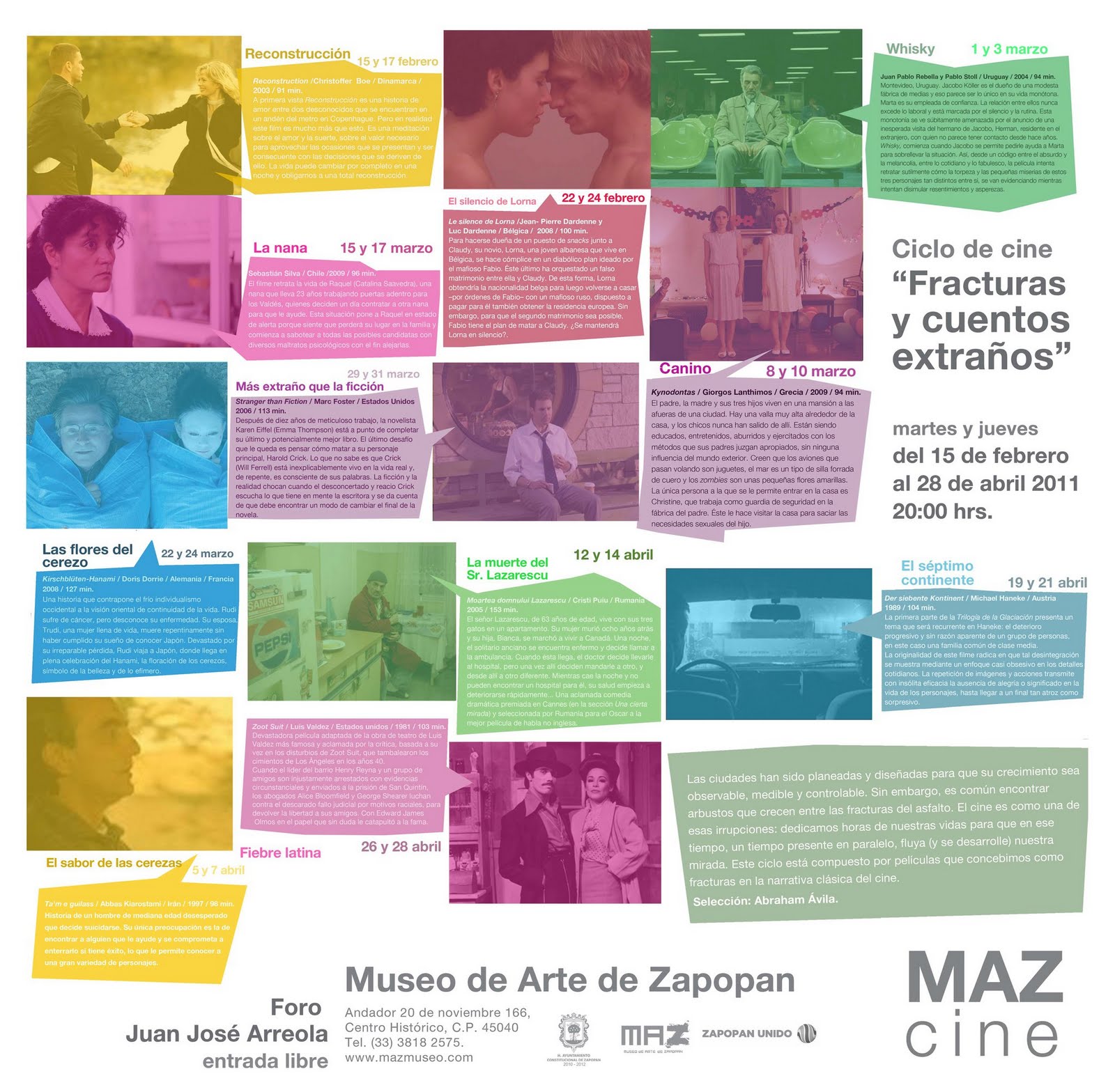 Nuevamente, el Museo de Arte de Zapopan nos brinda un ciclo de cine para los que gustamos de las opciones no comerciales. Este ciclo comenzó el 15 de Febrero del año en curso, y culminará el 28 de abril. Las proyecciones son todos los martes y jueves, a las 20:00 hrs, en el Foro Juan José Arreola del MAZ (Andador 20 de Noviembre#166, Centro Histórico, Zapopan, Jalisco, Méx.) Pueden ver la cartelera completa picándole al póster (para verla en grande, abran la imagen en una nueva ventana del explorador).