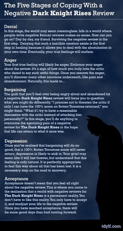La culpa que sentirás por haberte sentido enojado y abandonado a raíz de la reseña negativa de The Dark Knight Rises te obligará a preguntarte qué podrías haber hecho de manera diferente. “Prometo no amenazar al crítico si tan sólo nos devuelven la calificación de 100% en Rotten Tomatoes,” podrías pensar. “¿Qué tal si trato de sostener una discusión racional con el crítico en lugar de atacarlo personalmente?” En esta etapa, harás cualquier cosa por superar el dolor agonizante ocasionado por la reseña negativa de The Dark Knight Rises, con la esperanza de que la vida regrese a como solía ser.