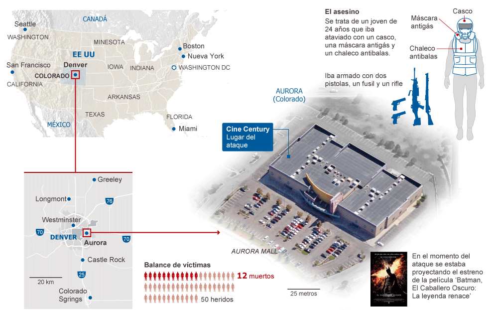 Los hechos se registraron aproximadamente a las oo:30 horas de hoy, cuando James Holmes, de 24 años, se paró en la parte delantera de una de las salas de Century 16 en el Aurora Mall.